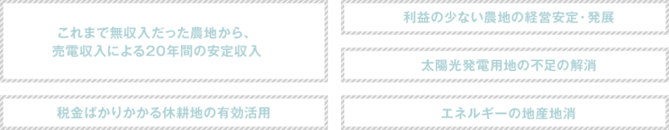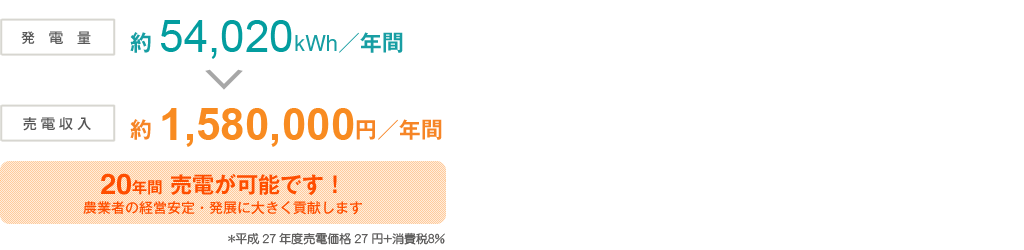 | 従来の米作農家の1反あたりの年間収入は10万円と言われています。 1反の農地に50kWのアグリソーラーを設置すると、下記条件で年間約150万円以上を売電でき、 従来の米作収入の約15倍以上と、農業者の経営安定が期待できます。 |