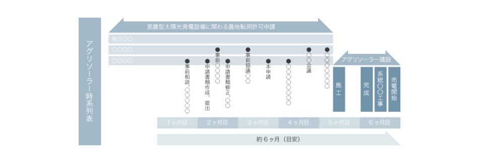 | 実際にご契約お申込みをされてから約6ヶ月が目安となります。 但し、地域によって電力会社や行政の承認手続きにより、スケジュールが前後する場合があります。 |